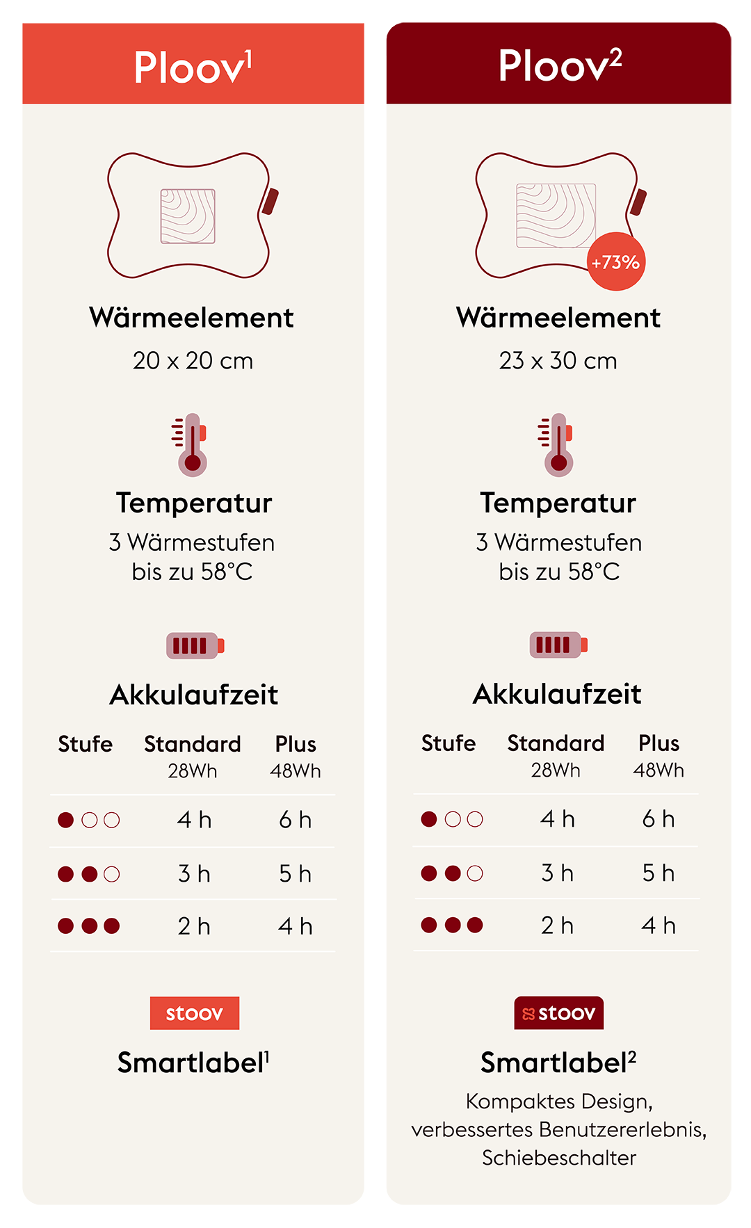 Je nach Produkt, Batterietyp und Wärmestufe hält dich ein Stoov mit einer einzigen Ladung bis zu 14 Stunden lang warm. Perfekt für einen ganzen Arbeitstag, einen langen Abend auf der Couch oder eine Nacht beim Camping.